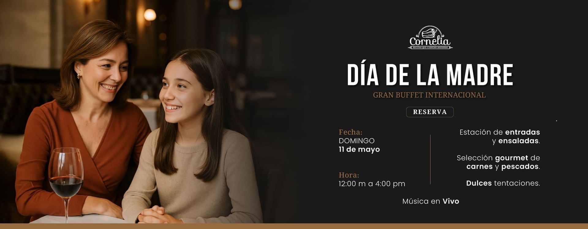 Celebra el día de la madre en la cocina de Cornelia que se destaca por sus cortes de carne cocinados a fuego lento, su arroz meloso con frutos del mar y su asado de tira. La lista de vinos, licores y cócteles hace de Cornelia el lugar ideal para tomar un trago con amigos y socios.